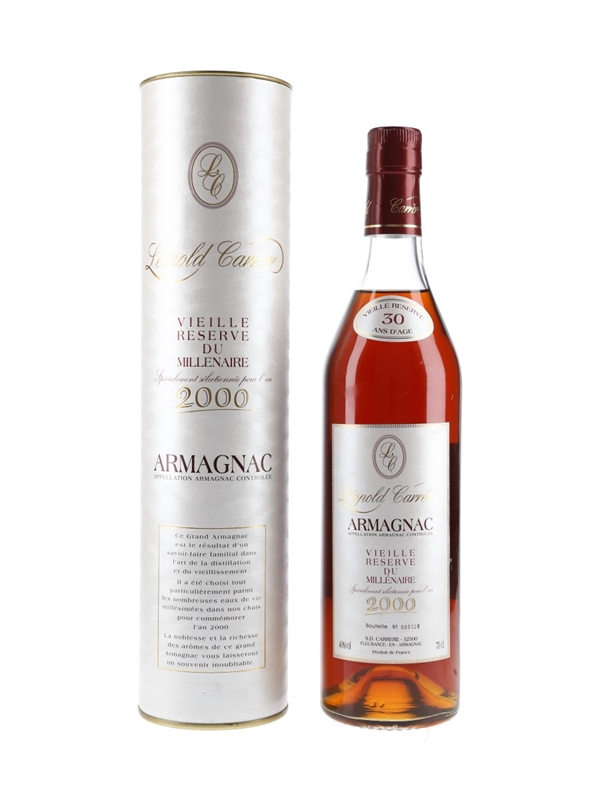 A bottle of Leopold Carrere 30 Year Old Armagnac, specially bottled for the millennium.