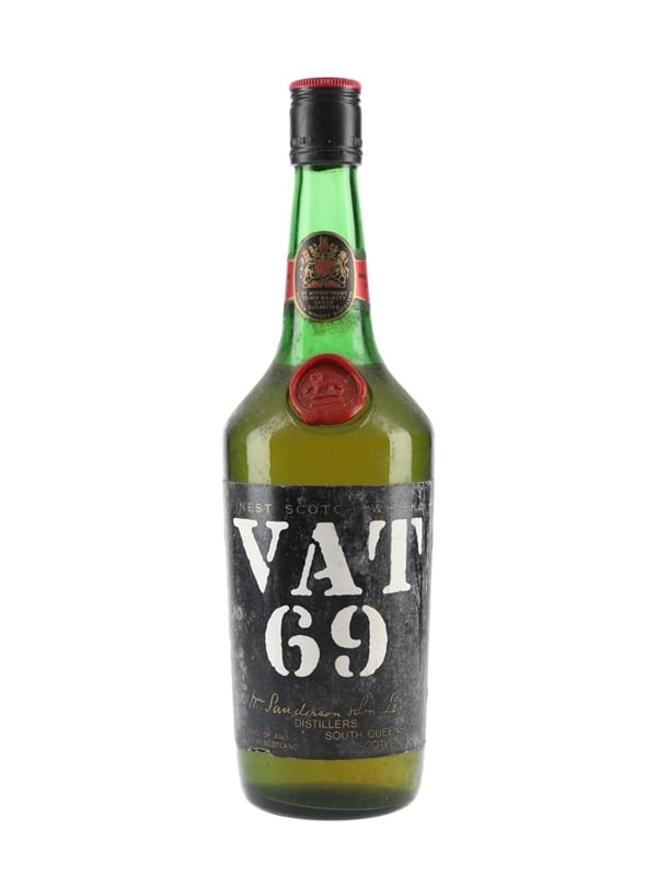 A bottle of Vat 69 Finest Scotch Whisky produced by Sanderson & Son Ltd. We estimate this was bottled in the 1970s.