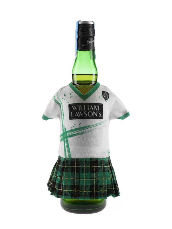A bottle of William Lawson's Blended Scotch Whisky dressed in a rugby shirt and kilt combo.