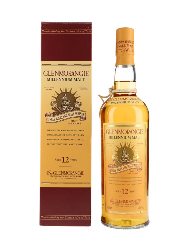 A bottle of Glenmorangie 12 Year Old Millenium Malt Single Highland Malt Scotch Whisky, matured in first fill casks and bottled to celebrate the new millennium. The bottling code indicates this was bottled in 2001.