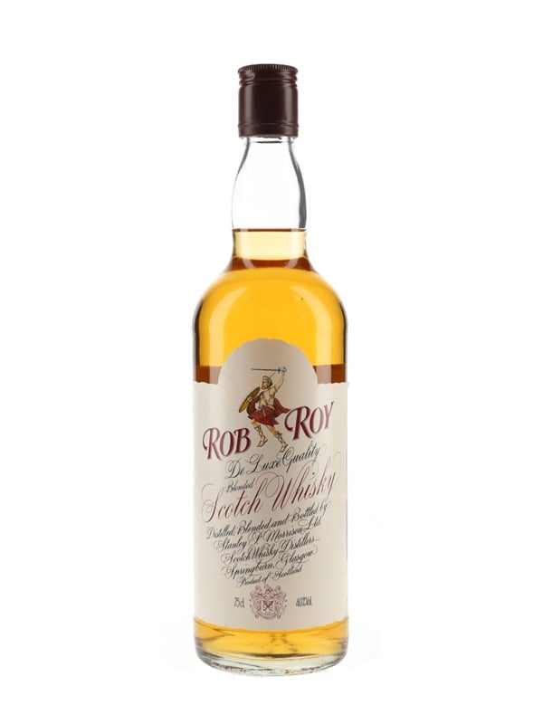 A bottle of Rob Roy De Luxe Quality Blended Scotch Whisky distilled, blended and bottled by Stanley P Morrison Ltd. We estimate