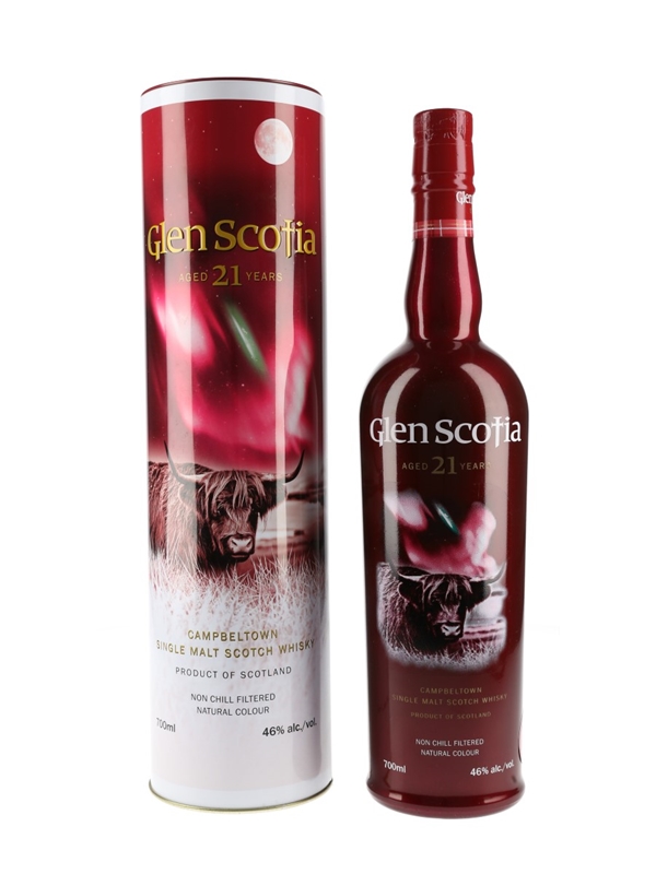 A bottle of Glen Scotia 21 Year Old Single Malt Scotch Whisky.