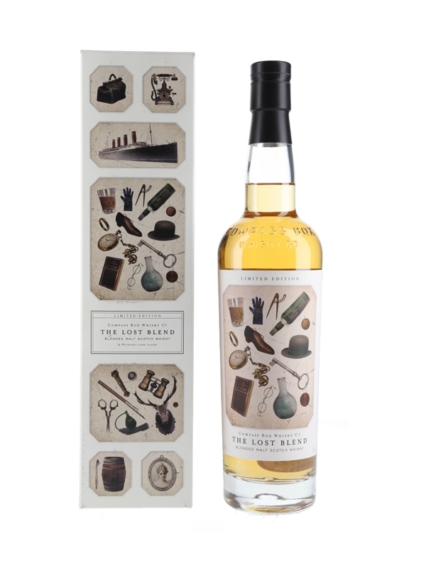 A limited edition bottle of The Lost Blend, a Limited Edition Blended Malt Scotch Whisky produced by Compass Box Whisky Co. and released in 2014. This is a blended malt comprising 80% unpeated Highland malts from Clynelish and Allt-a-Bhainne, and 20% peated Islay malt from Caol Ila.
