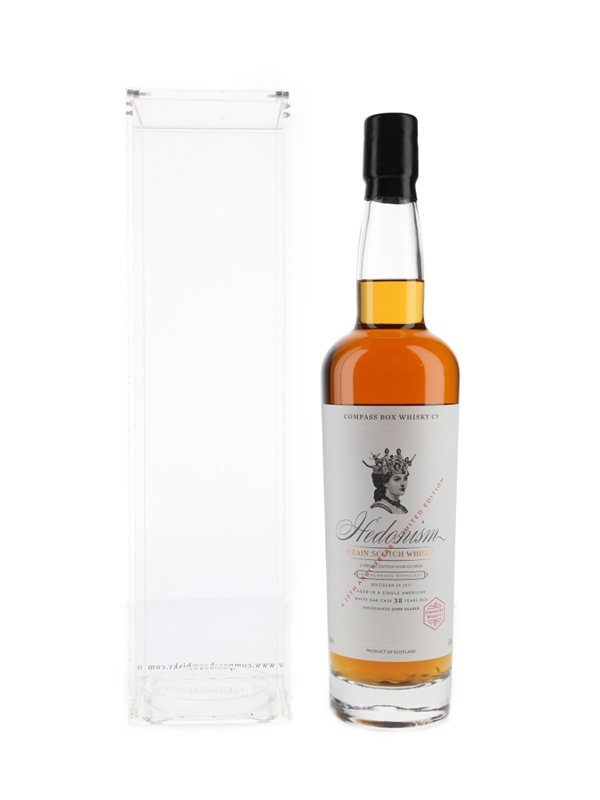 A limited edition bottle of Hedonism Grain Scotch Whisky, bottled by Compass Box to celebrate its 10th anniversary in 2010. While the regular release of Hedonism is a blend of grain whiskies, this limited edition is from a single American white oak cask distilled at Invergordon distillery in 1971. It was matured for 38 years then bottled in October 2010.
