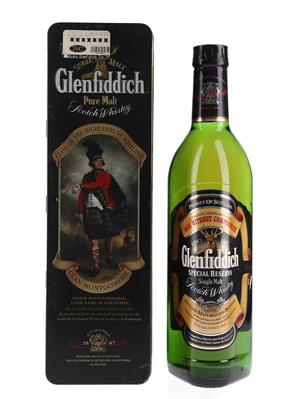 A bottle of Glenfiddich Special Reserve Single Malt Scotch Whisky, distilled, matured and bottled by William Grant & Sons Ltd. and presented in a Clans of the Highlands of Scotland presentation tin.