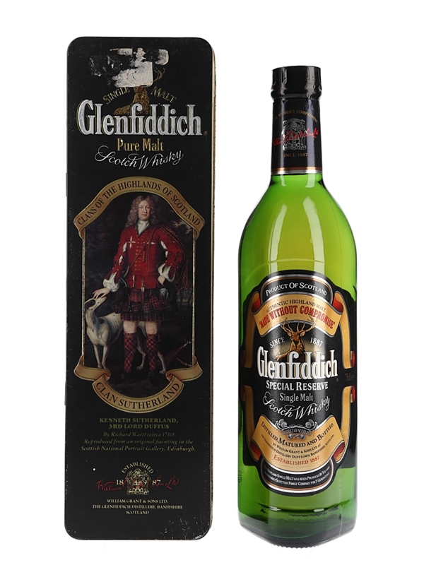 A bottle of Glenfiddich Special Reserve Single Pure Malt Scotch Whisky presented in a Clans of the Highlands of Scotland tin. We estimate this was bottled in the 1980s.