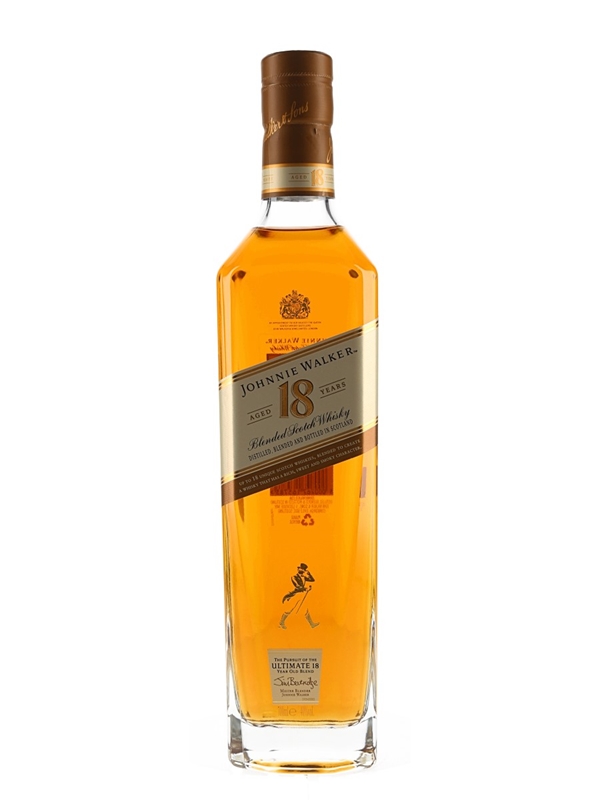 A bottle of Johnnie Walker 18 Year Old blended Scotch whisky. This expression replaced the Platinum Label, which has now been discontinued.