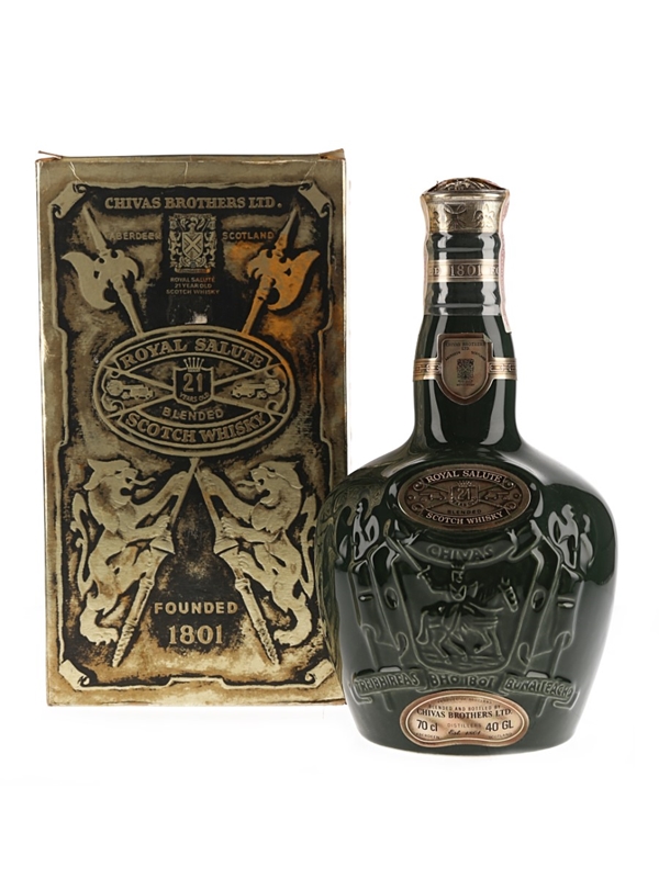 A bottle of Royal Salute 21 Year Old Blended Scotch Whisky, produced by Chivas Brothers Limited and presented in a green Spode Wade decanter with the original velvet bag. We estimate this was bottled in the 1970s.