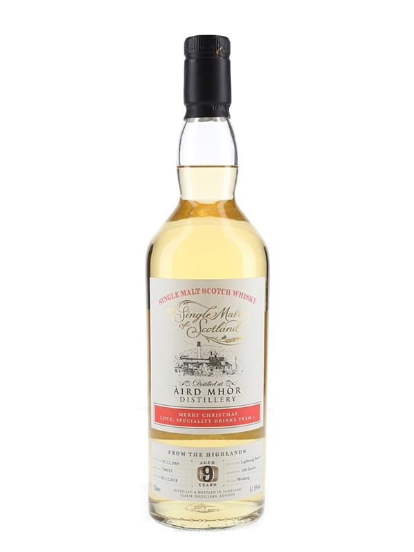 A bottle of Aird Mhor 9 Year Old Single Malt Scotch Whisky. This was distilled in 2009 at Ardmore distillery, matured in a Laphroaig barrel and bottled by Elixir Distillers on 3 December 2018 for the Single Malts of Scotland series.
