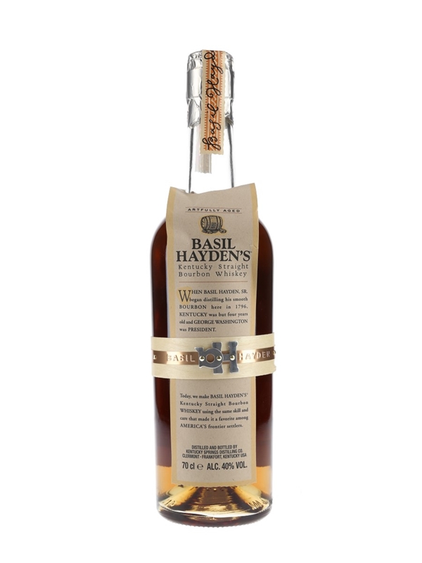 A bottle of Basil Hayden's Kentucky Straight Bourbon Whiskey, distilled and bottled by Kentucky Springs Distilling Co.