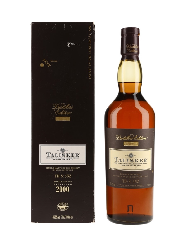 A bottle of Talisker 2000 Single Malt Scotch Whisky from the Isle of Skye. This was distilled in 2000, double matured in Amoroso wood and bottled in 2011 for the Distillers Edition series.