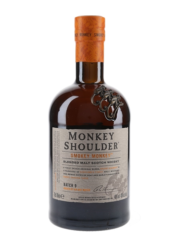 A bottle of Monkey Shoulder Smokey Monkey Batch 9, a Blended Malt Scotch Whisky distilled, matured and bottled by William Grant & Sons Ltd.