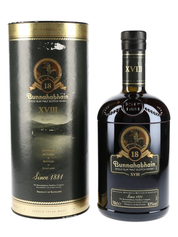 A bottle of Bunnahabhain 18 Year Old Single Malt Scotch Whisky from Islay.