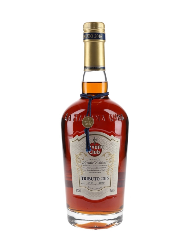 A limited edition bottle of Havana Club Tributo 2016 the first release in Havana Club's Tributo series. This is a blend of rums aged for up to 80 years.
