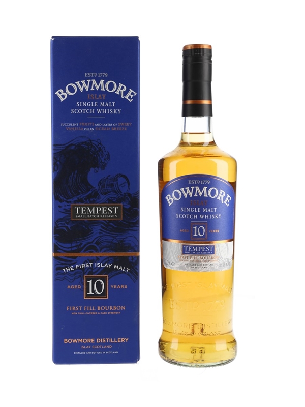 A bottle of Bowmore Tempest 10 Year Old, a small batch release that was matured in first fill bourbon casks before bottling in 2014. This is the fifth release.