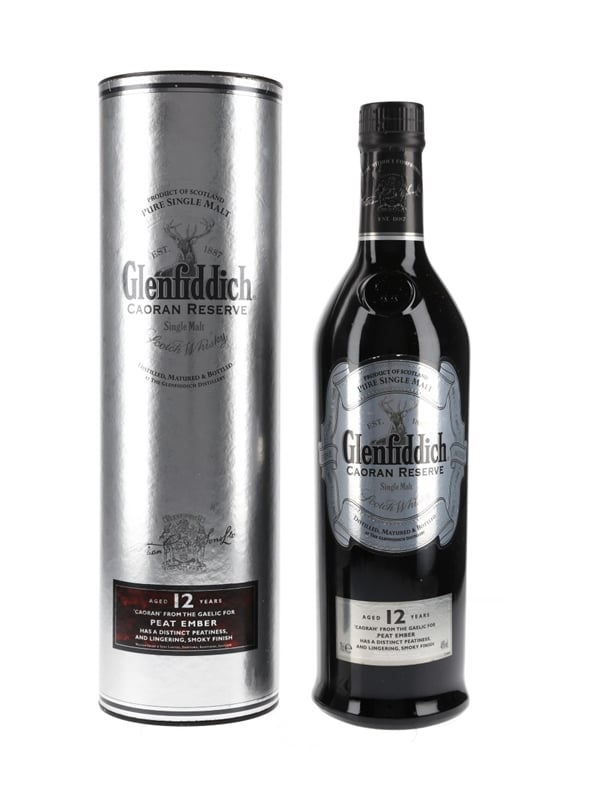 A bottle of Glenfiddich's discontinued Caoran Reserve 12 Year Old Single Malt Scotch Whisky. Subtitled 'Peat Ember', this uses lightly peated barley for a smoky twist on the traditional Glenfiddich character. This is the silver labelled version.