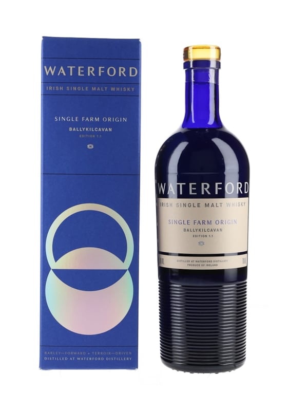 A bottle of Waterford Single Farm Origin Irish Single Malt Whisky, Ballykilcavan Edition 1.1. The barley for this whisky was grown in Ballykilcavan by David Walsh-Kemmis and harvested on 17 August 2015. This was distilled in the 8th week of 2016, matured for 3 years 11 months 18 Days and bottled in June 2020 at 50% ABV.