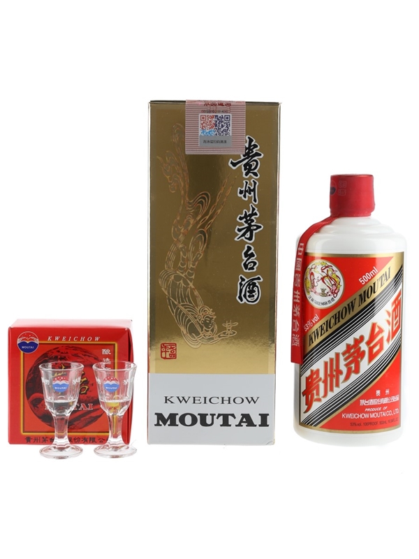 A 50cl bottle of Kweichow Moutai 2018 in a presentation box with two glasses.