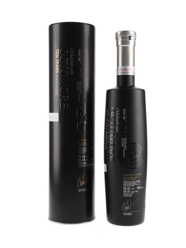 A bottle of Octomore 10 year old, a super heavily peated single malt Scotch whisky from Islay's Bruichladdich distillery.