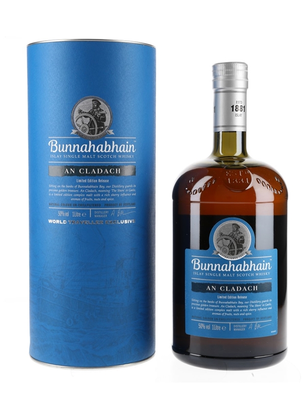 A litre bottle of Bunnahabhain An Cladach Islay Single Malt Scotch Whisky, bottled at 50% ABV for the travel retail market.