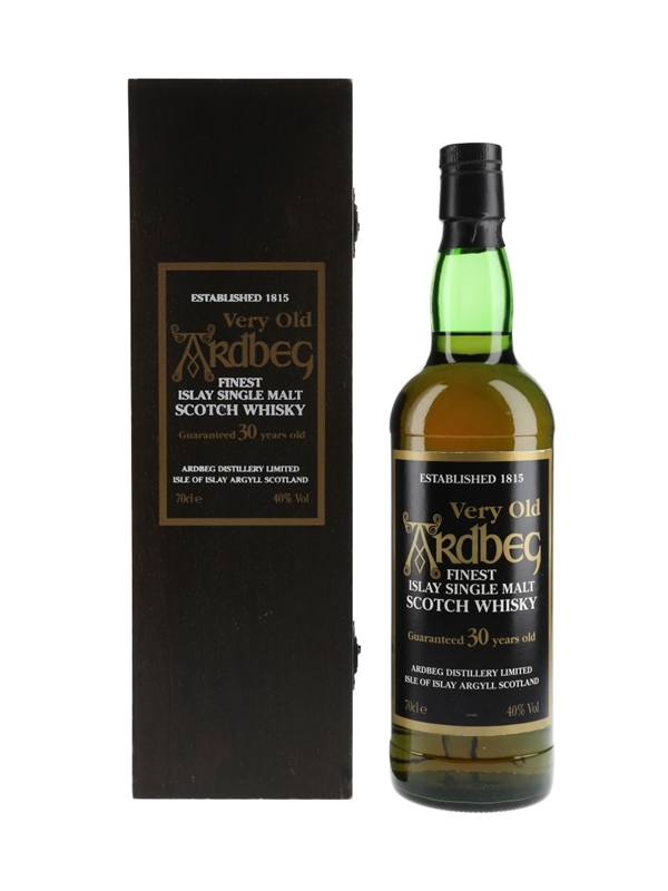 A bottle of Very Old Ardbeg 30 Year Old Finest Islay Single Malt Scotch Whisky with the old style black label. We estimate this was bottled in the 1990s.