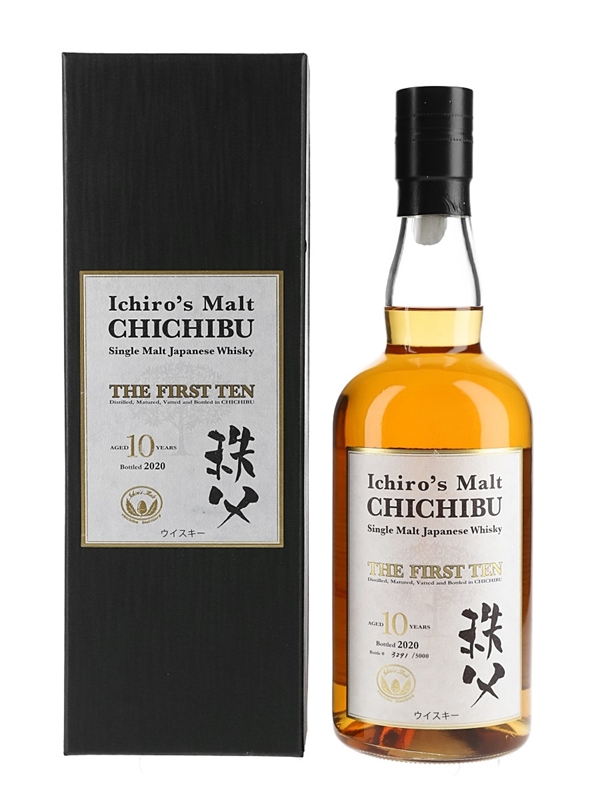 A bottle of Ichiro's Malt Chichibu The First Ten 10 Year Old Single Malt Japanese Whisky, bottled in 2020. This is the first 10 Year Old whisky to be released from Chichibu distillery. This was imported to the UK by Speciality Drinks.