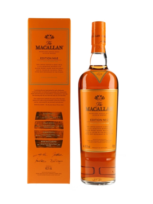 A bottle of The Macallan Edition No.2 Highland Single Malt Scotch Whisky. This is a limited edition matured in four distinct cask types selected by master blender Bob Delgarno and Spanish chefs Joan, Josep and Jordi Roca from El Celler de Can Roca. The restaurant was twice voted best restaurant in the world.