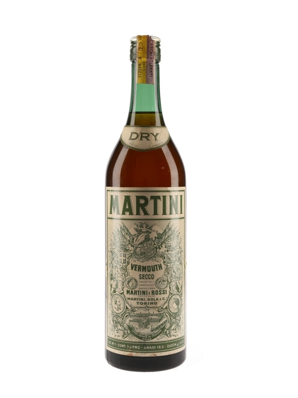 A liter bottle of Martini Dry Vermouth produced in Italy. We estimate this was bottled in the 1960s to 1970s.