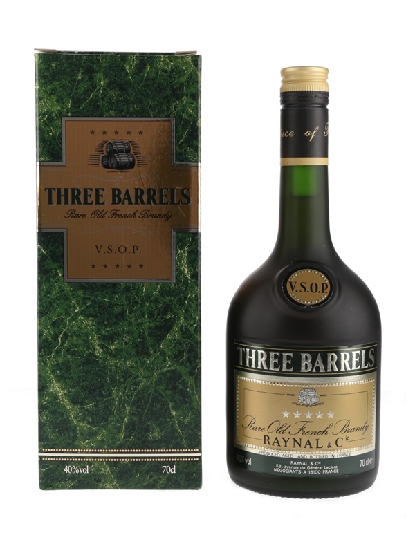 A bottle of Three Barrels VSOP 5 Star Rare Old French Brandy. We estimate this was bottled in the 1990s.