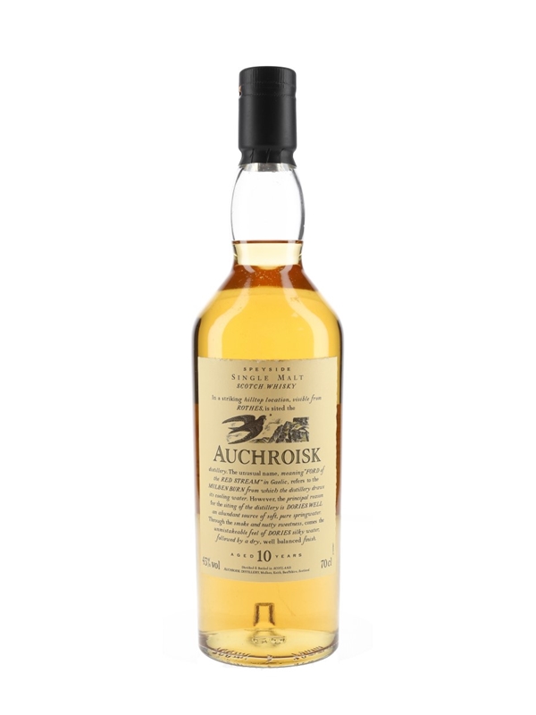 A bottle of Auchroisk 10 Year Old Speyside Single Malt Scotch Whisky from Diageo's Flora & Fauna collection.