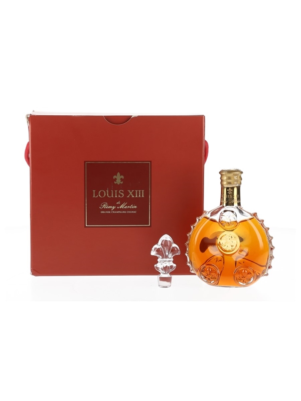 A miniature bottle of Rémy Martin Louis XIII Cognac, presented in a Baccarat crystal decanter with stopper. This is composed of Grande Champagne eaux-de-vie aged between 40 and 100 years.