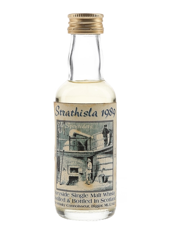 A miniature bottle of Strathisla 1989 Speyside Single Malt Whisky, The Speysiders No.1, bottled by The Whisky Connoisseur.