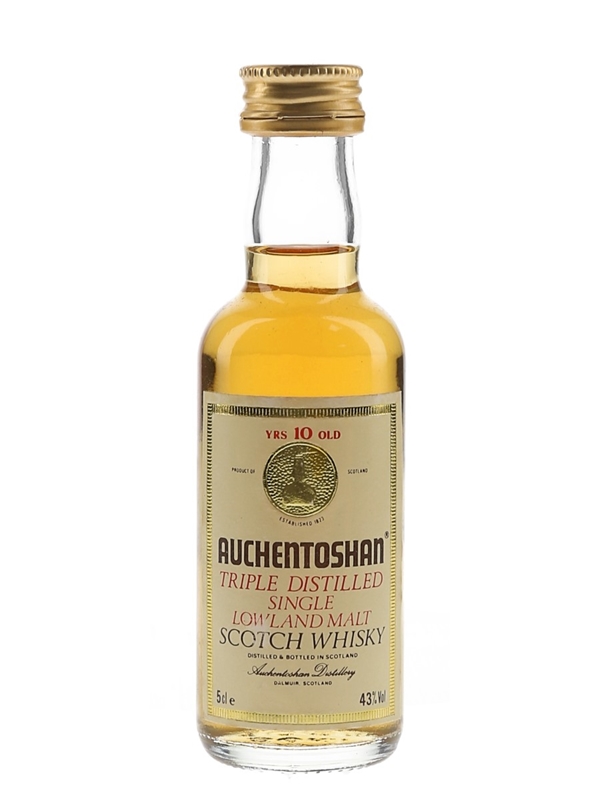 A miniature bottle of Auchentoshan 10 Year Old Triple Distilled Single Lowland Malt Scotch Whisky. We estimate this was bottled in the 1980s.