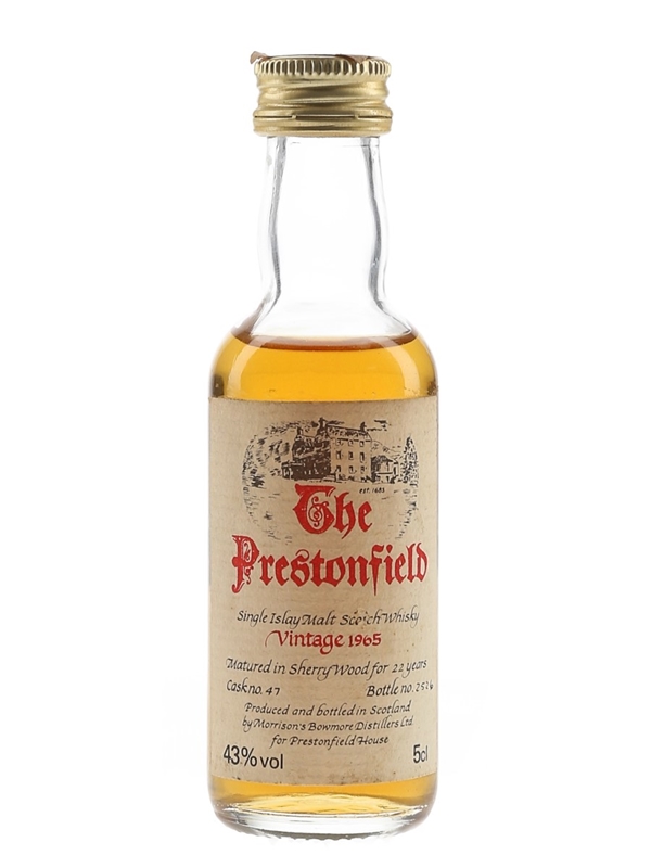 A miniature bottle of The Prestonfield 1965 Single Malt Islay Scotch Whisky bottled by Morrison's Bowmore Distillers Ltd. for Prestonfield House, a five star boutique hotel in Edinburgh.