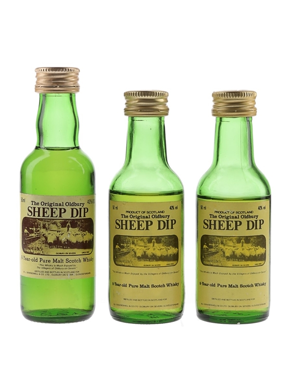 This lot contains three miniature bottles of The Original Oldbury Sheep Dip 8 Year Old Pure Malt Scotch Whisky, complete with a picture of sheep being herded in Oldbury-on-Severn on the labels. We estimate these were bottled in the 1980s.
