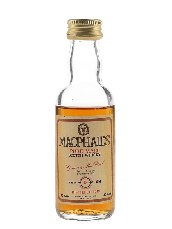 A miniature bottle of MacPhail's 45 Year Old Pure Malt Scotch Whisky. This was distilled in 1938 and bottled by Gordon & MacPhail.