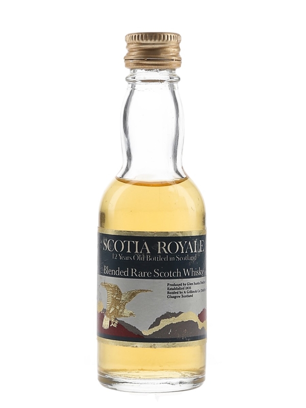 A miniature bottle of Scotia Royale 12 Year Old Blended Rare Scotch Whisky. This was produced by Glen Scotia Distillery and bottled by A Gillies & Co (Distillers) Ltd., we estimate in the 1970s.