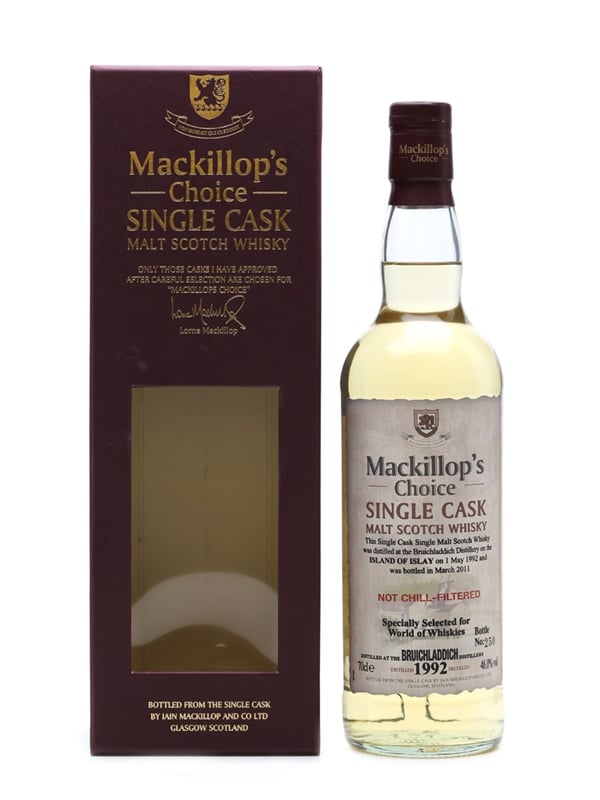 A single-cask release of 1992 Bruichladdich bottled in 2011 by independent bottler Mackillop's Choice for World Of Whiskies Duty Free.