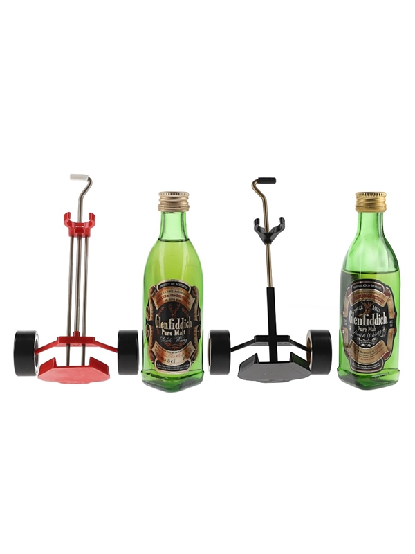 This lot contains two miniature bottles of Glenfiddich Pure Malt Scotch whisky, presented in miniature golf trolleys. We estimate these were bottled in the 1980s.