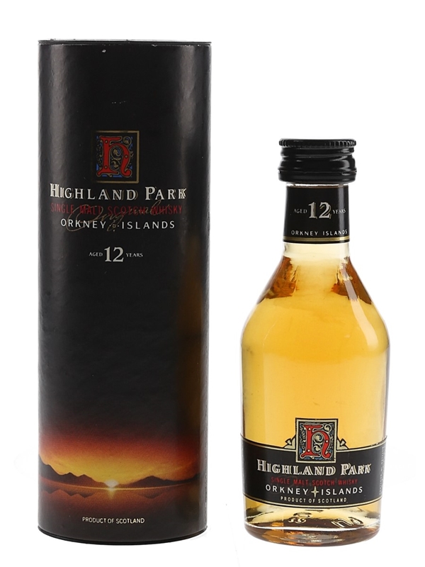 A miniature bottle of Highland Park 12 Year Old Single Malt Scotch Whisky. We estimate this was bottled in the 1990s.