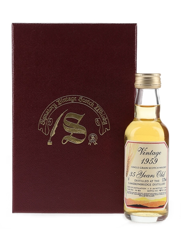 A miniature bottle of Cameronbridge 35 Year Old Single Grain Scotch Whisky. This was distilled on 11 September 1959 and bottled in September 1994 by Signatory Vintage. This is bottle number 78 of 120, it was bottled from cask number 33/88.