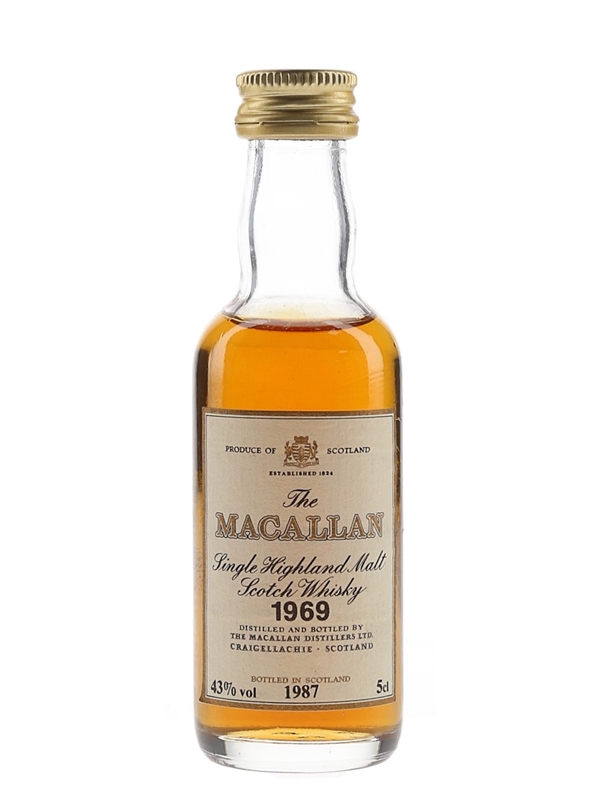 A miniature bottle of The Macallan 1969 Single Highland Malt Scotch Whisky. This was distilled in 1969 and bottled in 1987 at 43% ABV.