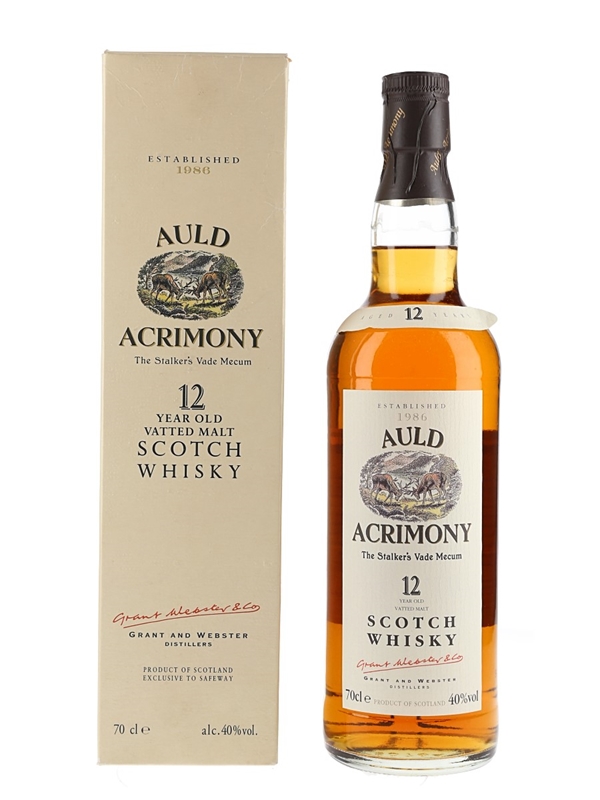 A bottle of Auld Acrimony 12 Year Old Vatted Malt Scotch Whisky. This was produced for Grant and Webster, we estimate in the 1990s.