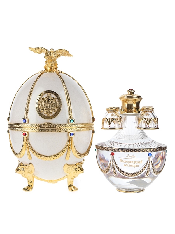 The presentation box contains a Fabergé style egg, decorated with crystal and gold detail and topped with a gold eagle. Inside the egg is a decanter containing super premium vodka, distilled from wheat and rye with water from Lake Ladoga, and four small glasses with gold and enamel decoration.