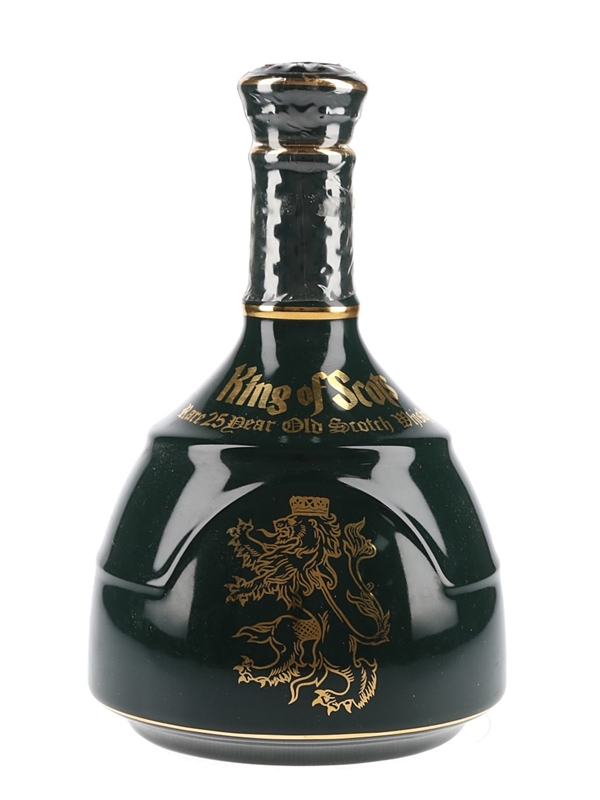A bottle of King of Scots 25 Year Old Scotch Whisky presented in a ceramic decanter.