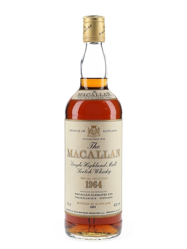 A bottle of The Macallan Single Highland Malt Scotch Whisky. This was distilled in 1964, matured in sherry casks and bottled in 1981 at 43% ABV. This was imported to the Italian market by Rinaldi.