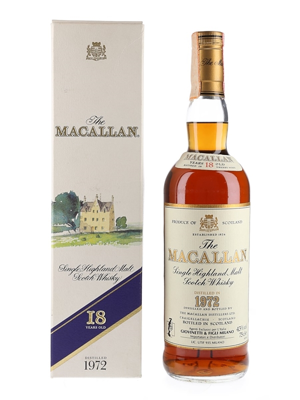 A bottle of The Macallan 18 Year Old Single Highland Malt Scotch Whisky, distilled in 1972 and matured in sherry casks. This was bottled for the Italian market and imported by Giovinetti, we estimate in the early 1990s.