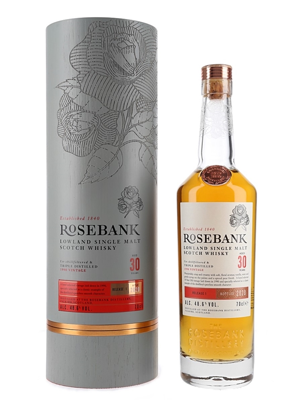 A bottle of Rosebank 30 Year Old Lowland Single Malt Scotch Whisky. This was distilled in 1990 and bottled in 2020.