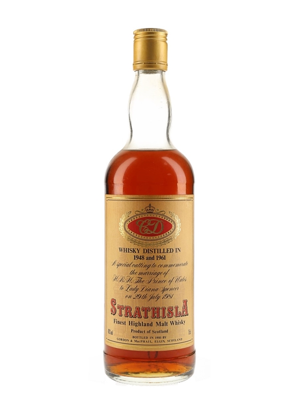 A bottle of Strathisla Finest Highland Malt Whisky from independent bottler Gordon & MacPhail. This is a vatting of two vintages, 1948 and 1961, and was bottled in 1981 to commemorate the marriage of Prince Charles and Lady Diana Spencer.