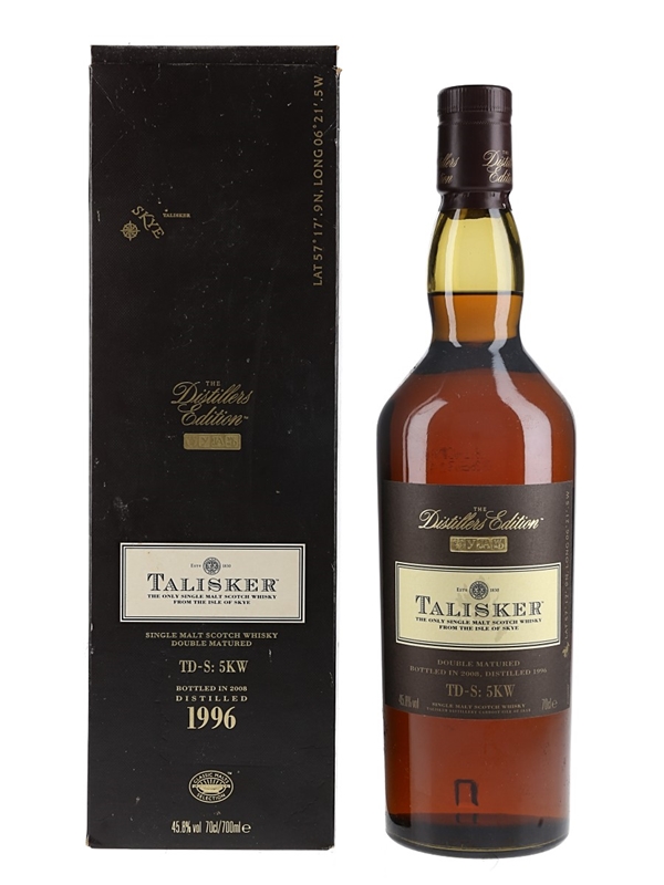 A bottle of Talisker 1996 Isle of Skye Double Matured Special Release Limited Edition Single Malt Scotch Whisky. This was distilled in 1996 and bottled for the Distillers Edition series.